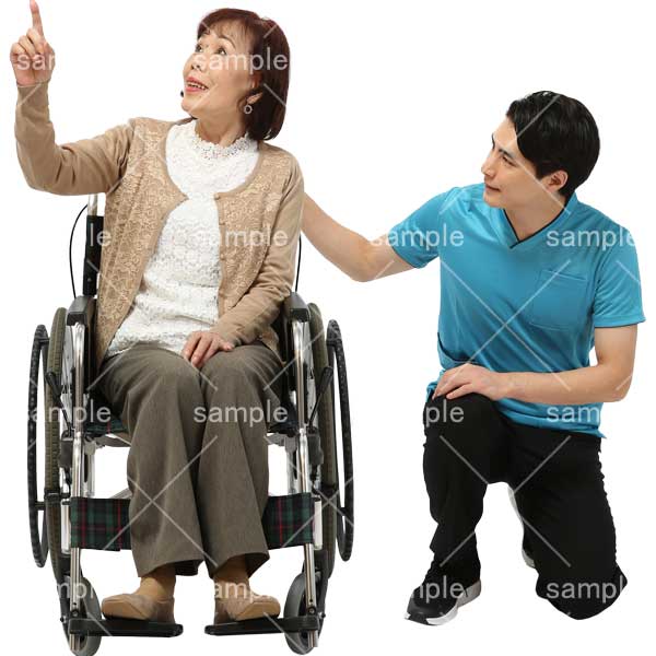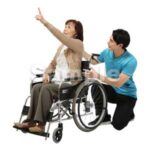 251106介護、介護スタッフ、老人ホーム、シニア、車椅子、話す、男性、女性、おばあさん、指差す、Care staff, nursing home, senior, wheelchair, talking, man, woman, grandmother, pointing