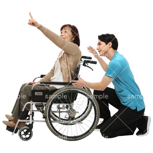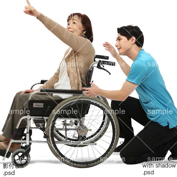 251106介護、介護スタッフ、老人ホーム、シニア、車椅子、話す、男性、女性、おばあさん、指差す、Care staff, nursing home, senior, wheelchair, talking, man, woman, grandmother, pointing