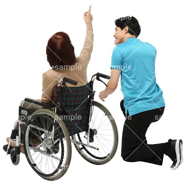 251106介護、介護スタッフ、老人ホーム、シニア、車椅子、話す、男性、女性、おばあさん、指差す、Care staff, nursing home, senior, wheelchair, talking, man, woman, grandmother, pointing