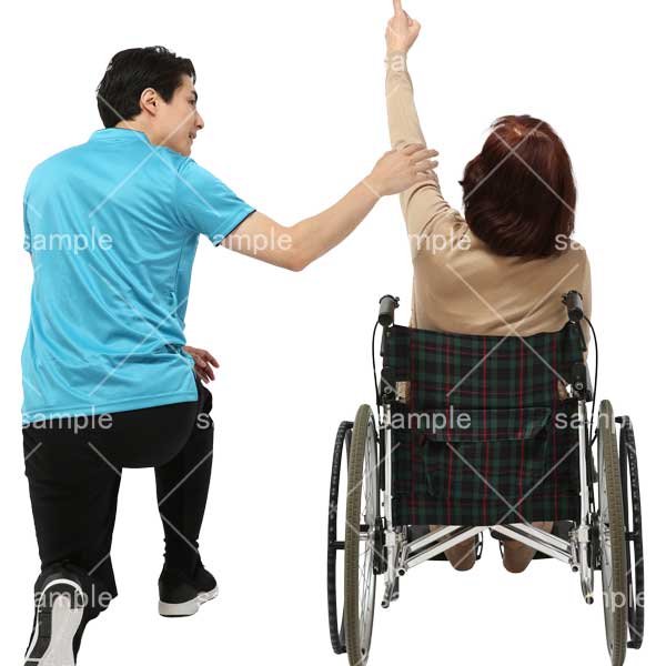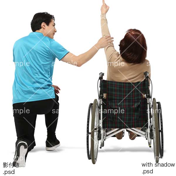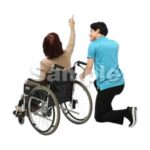 251106介護、介護スタッフ、老人ホーム、シニア、車椅子、話す、男性、女性、おばあさん、指差す、Care staff, nursing home, senior, wheelchair, talking, man, woman, grandmother, pointing