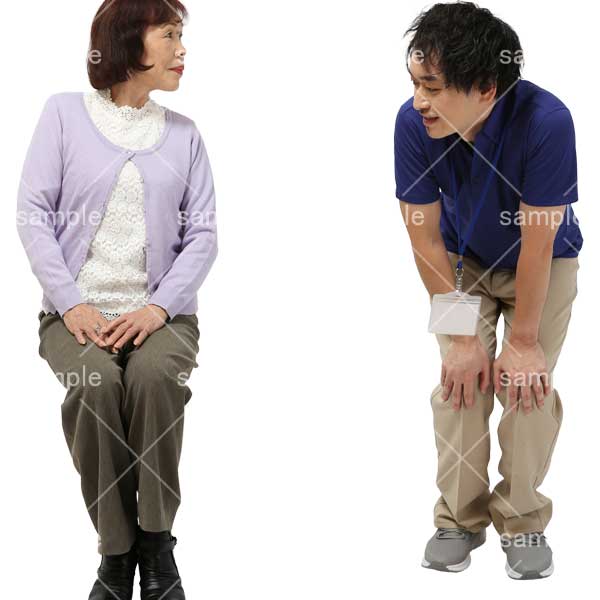 251106介護、介護スタッフ、老人ホーム、シニア、話す、女性、おばあさん、座る、スリッパ、男性スタッフ、Care staff, nursing home, senior, talking, woman, grandmother, sitting, slippers, male staff