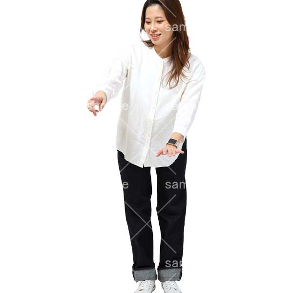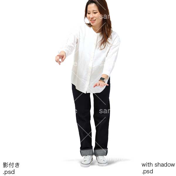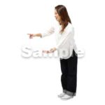 250909動作、日本人、女性、ロングヘアー、デニム、ジーンズ、白色、指をさす、指さす、Action, Japanese, woman, long hair, denim, jeans, white, pointing, pointing