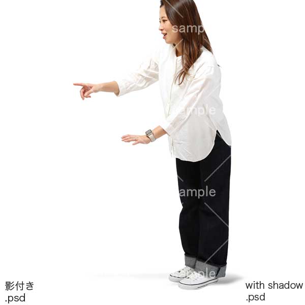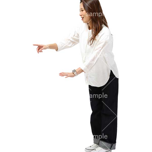 250909動作、日本人、女性、ロングヘアー、デニム、ジーンズ、白色、指をさす、指さす、Action, Japanese, woman, long hair, denim, jeans, white, pointing, pointing