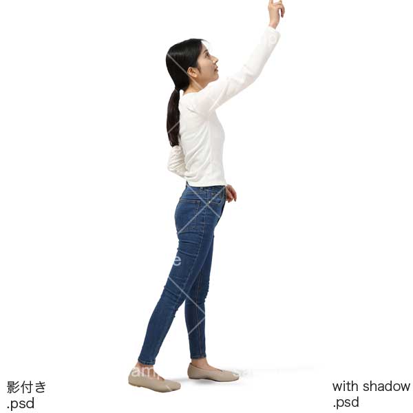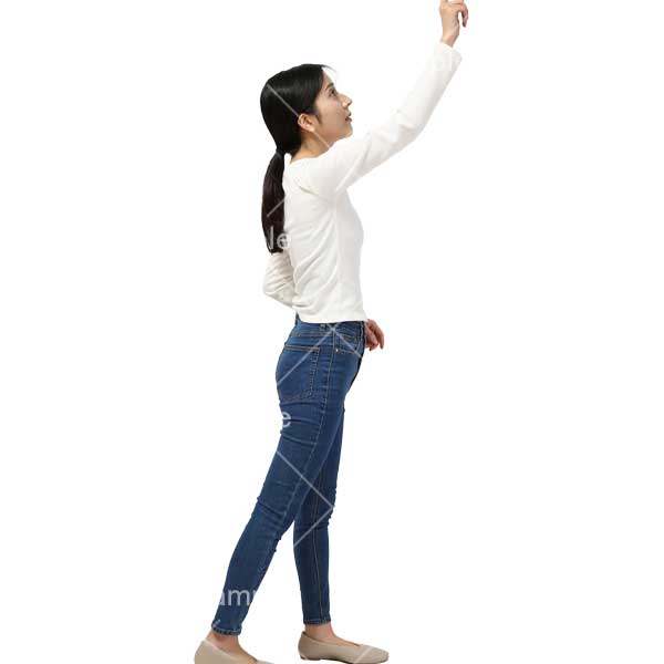 250909動作、日本人、女性、デニム、ジーンズ、スキニー、細身、、手を出す、上を向く、手をあげる、上のものを取る、Action, Japanese, woman, denim, jeans, skinny, slim, reach out, look up, raise hand, take something on top