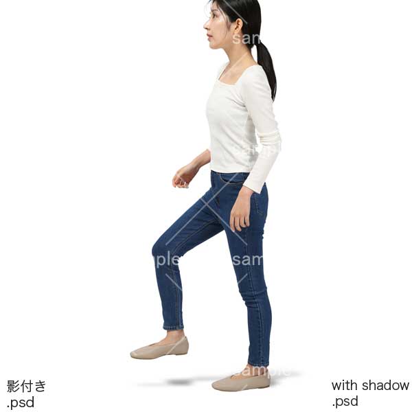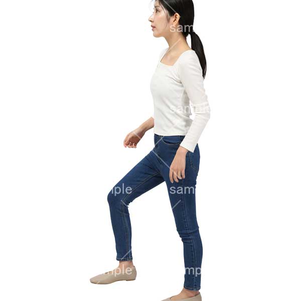 250909動作、日本人、女性、デニム、ジーンズ、スキニー、細身、階段を登る、一段上がる、Movement, Japanese, woman, denim, jeans, skinny, slim, climbing stairs, step up