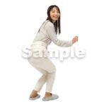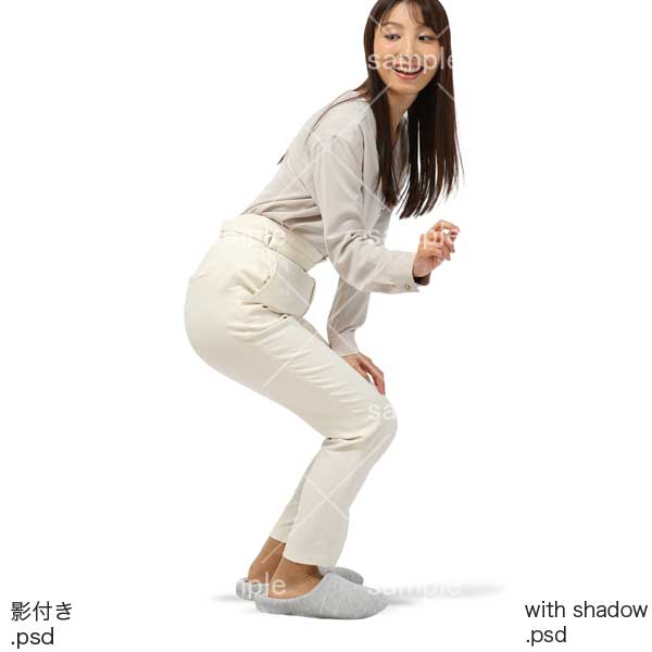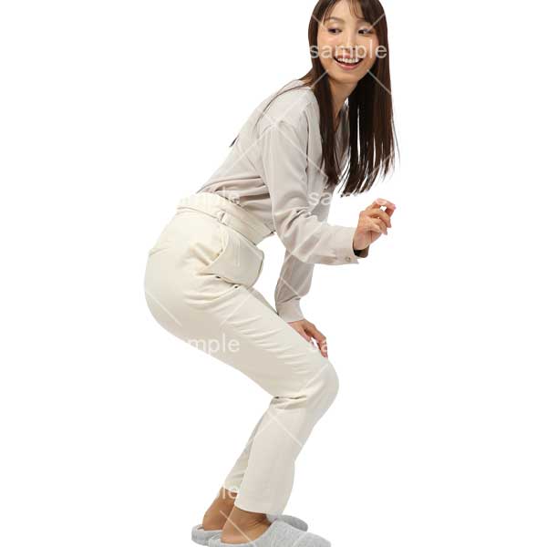 250909動作、日本人、女性、振り返る、振り向く、腰を落とす、膝を曲げる、スリッパ、室内、Action, Japanese, woman, looking back, turning around, lowering, bending knees, slippers, indoors