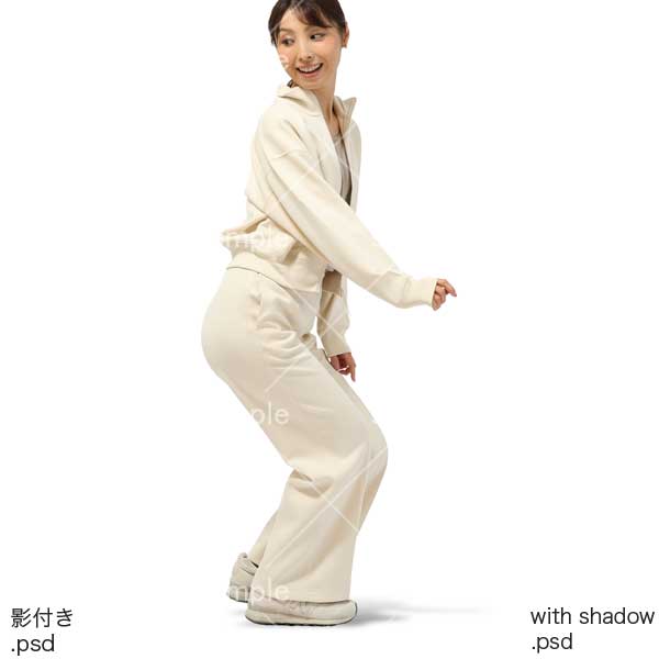 250909動作、日本人、女性、手を出す、腰を落とす、膝を曲げる、アイボリー、Movement, Japanese, woman, hands out, lowering, bending knees, ivory