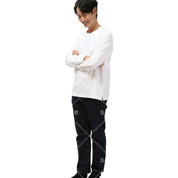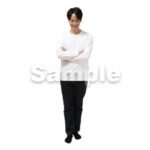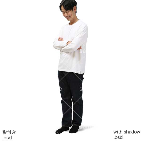 250909動作、日本人、男性、腕を組む、腕組みする、下を見る、白色、黒色、モノトーン、シンプルファッション、Action, Japanese, man, arms crossed, arms folded, looking down, white, black, monotone, simple fashio