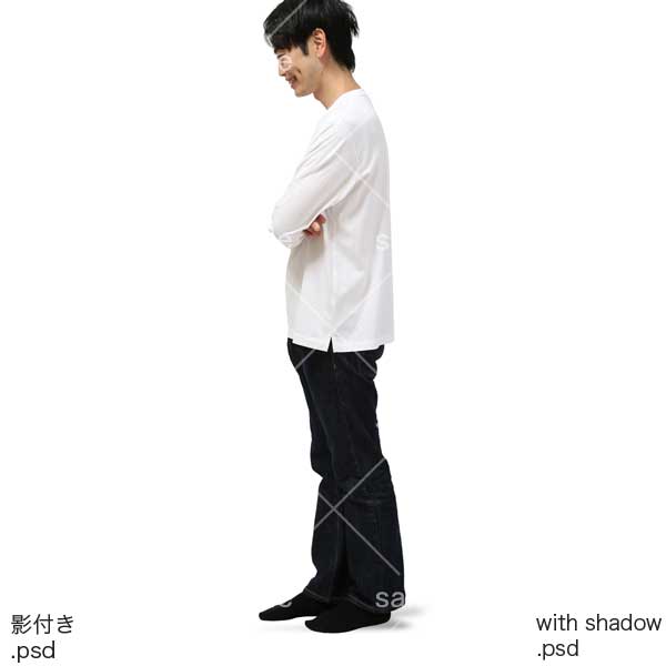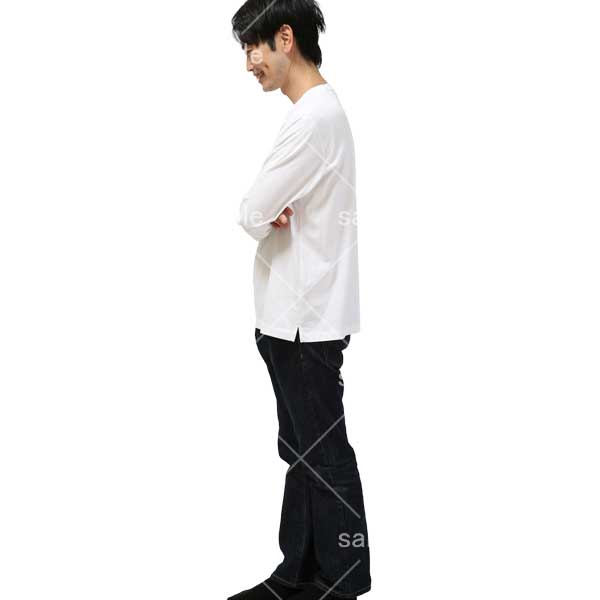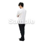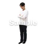 250909動作、日本人、男性、腕を組む、腕組みする、下を見る、白色、黒色、モノトーン、シンプルファッション、Action, Japanese, man, arms crossed, arms folded, looking down, white, black, monotone, simple fashio