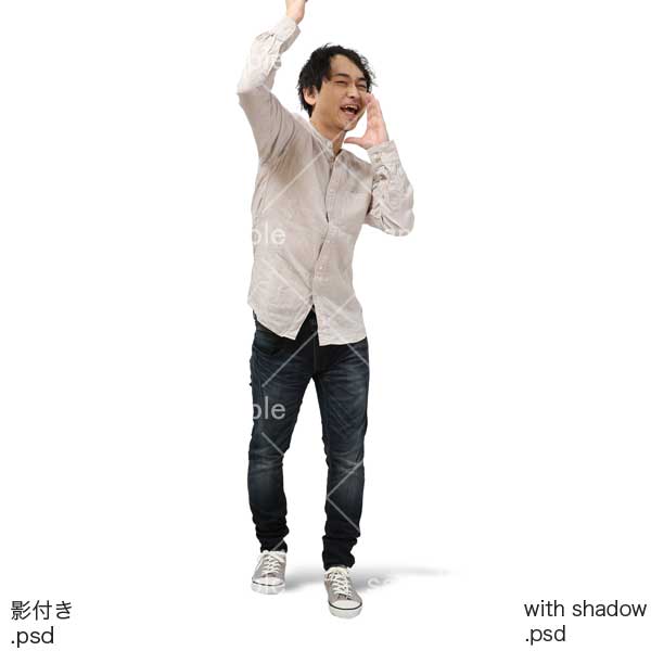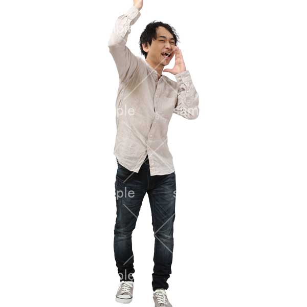250909動作、日本人、男性、応援する、拳をあげる、大声を出す、デニム、ジーンズ、Action, Japanese, man, cheering, raising fist, shouting, denim, jeans