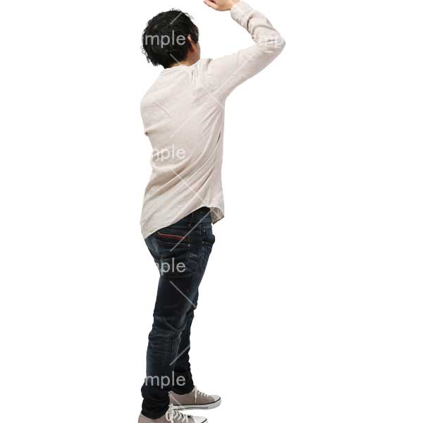 250909動作、日本人、男性、応援する、拳をあげる、大声を出す、デニム、ジーンズ、Action, Japanese, man, cheering, raising fist, shouting, denim, jeans