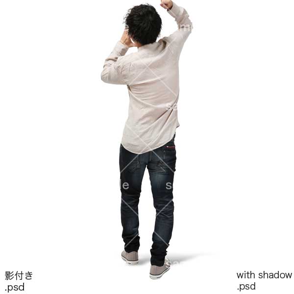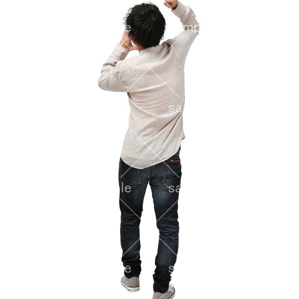 250909動作、日本人、男性、応援する、拳をあげる、大声を出す、デニム、ジーンズ、Action, Japanese, man, cheering, raising fist, shouting, denim, jeans