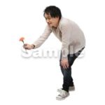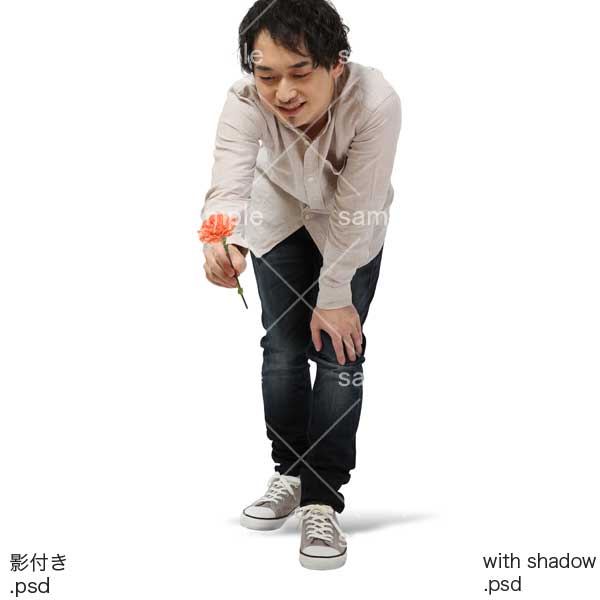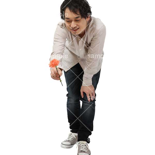 250909動作、日本人、男性、一輪の花、差し出す、中腰、低い腰、Action, Japanese, man, single flower, offering, half-squat, low waist