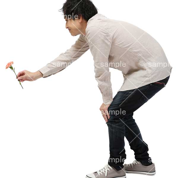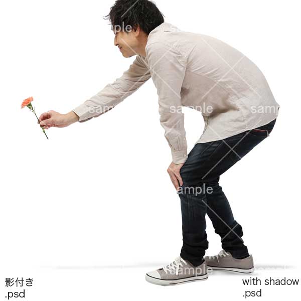 250909動作、日本人、男性、一輪の花、差し出す、中腰、低い腰、Action, Japanese, man, single flower, offering, half-squat, low waist