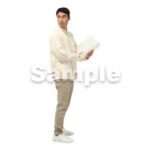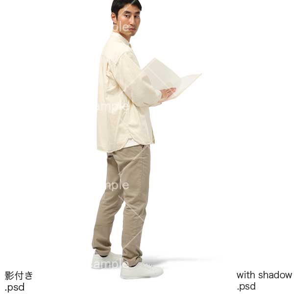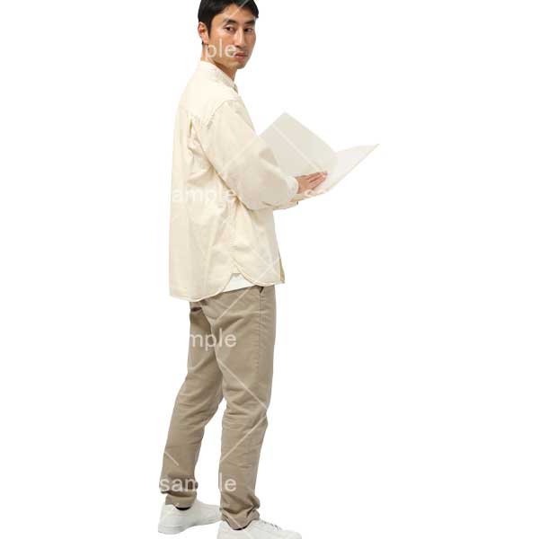 250909動作、日本人、男性、書類、振り向く、振り返る、ベージュ、アイボリー、落ち着いた色、Movement, Japanese, man, document, turning around, looking back, beige, ivory, calm colors
