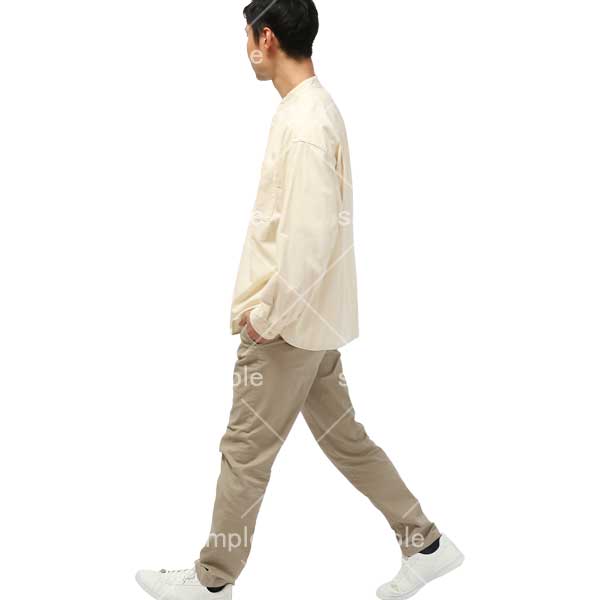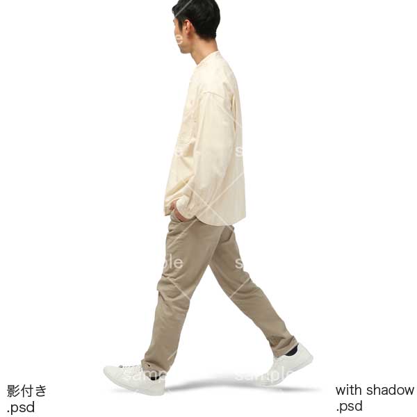 250909動作、日本人、男性、犬の散歩、ポケットに手を入れる、歩く、チノパン、ベージュ、アイボリー、Action, Japanese, man, walking dog, hands in pockets, walking, chinos, beige, ivory
