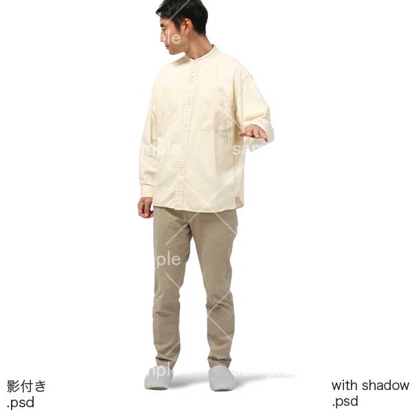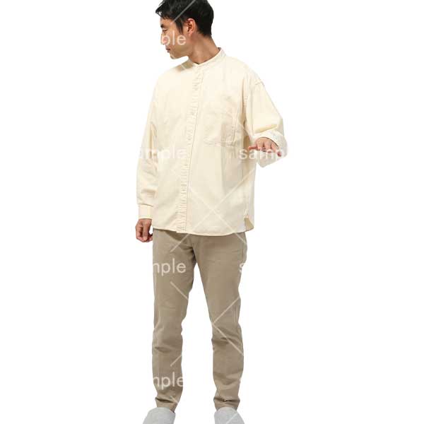 250909動作、日本人、男性、振り向く、振り返る、チノパン、ネージュ、アイボリー、手を出す、30代、Action, Japanese, man, turning around, looking back, chinos, neige, ivory, reaching out, 30s