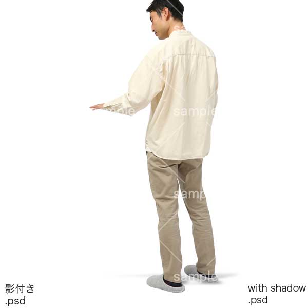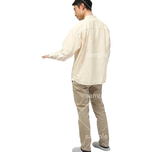 250909動作、日本人、男性、振り向く、振り返る、チノパン、ネージュ、アイボリー、手を出す、30代、Action, Japanese, man, turning around, looking back, chinos, neige, ivory, reaching out, 30s