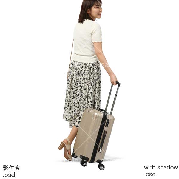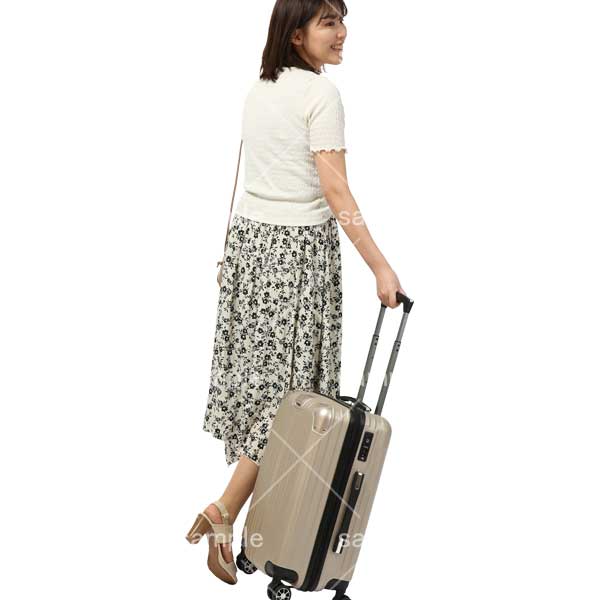250701夏服、日本人、夏服、半袖、リゾート、旅行、スーツケース、キャリーバッグ、ロングスカート、20代、女性、Japanese, summer clothes, short sleeves, resort, travel, suitcase, carry bag, long skirt, 20s, woma