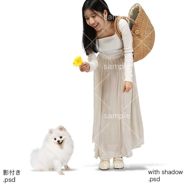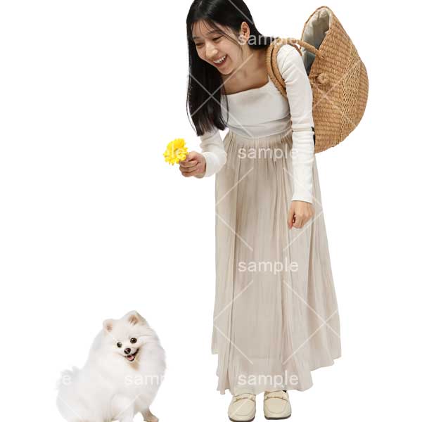 250811犬の散歩、日本人、動物、犬、猫、リード、女性、スカート、かごバッグ、一輪の花、白いスピッツ、草原、Dog walking, Japanese, animals, dog, cat, leash, woman, skirt, basket bag, single flower, white spitz, grassland