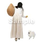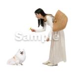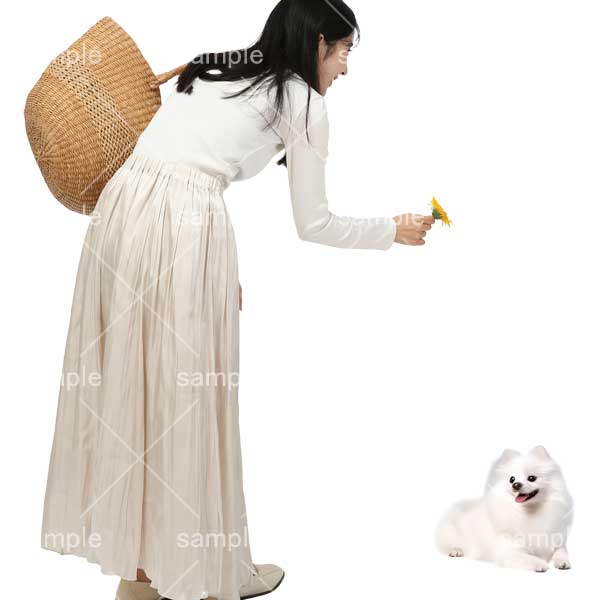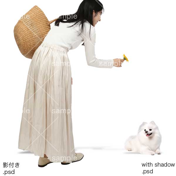 250811犬の散歩、日本人、動物、犬、猫、リード、女性、スカート、かごバッグ、一輪の花、白いスピッツ、草原、Dog walking, Japanese, animals, dog, cat, leash, woman, skirt, basket bag, single flower, white spitz, grassland
