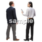 立つ、欧米人、アメリカ人、白人、日本人、タブレット、ipad、ビジネス、男性、話す、仕事、スーツ、黒色、ネクタイ、ペア、2人、ワイシャツ、メガネ、ひげ、ニット、ジャケット、茶色の靴、アジア人
