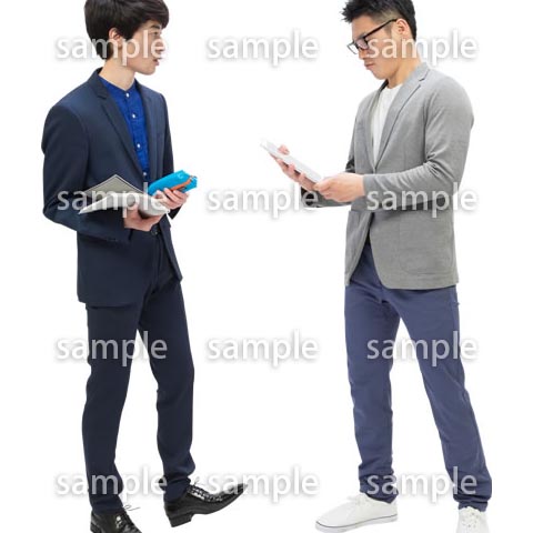日本人、ビジネス、2人、オフィス、男性、カジュアルビジネスファッション、カジュアルオフィス、クールビズ、立ち止まる、ミーティング、打ち合わせ、話す、書類、手帳、メガネ、ジャケット、若手、デザイナー、Japanese, business, two people, office, man, casual business fashion, casual office, cool biz, stopping, meeting, discussion, talking, document, notebook, glasses, jacket, young person, designer