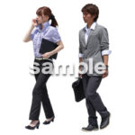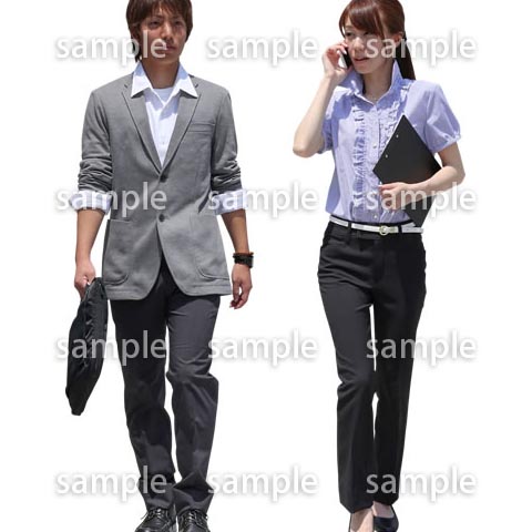 日本人、ビジネス、2人、オフィス、男性女性、カジュアルビジネスファッション、カジュアルオフィス、クールビズ、歩く、ビジネスバッグ、スマホ、電話をかける、ポニーテール、美人、太陽光、茶髪、Japanese, business, two people, office, male/female, casual business fashion, casual office, cool biz, walking, business bag, smartphone, making a call, ponytail, beauty, sunlight, brown hair