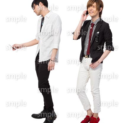 日本人、ショッピング、買い物、都会、男性、二人、カジュアル、大学生、スマホ、電話、話す、タッチ、手を出す、茶髪、赤い靴、Japanese, shopping, shopping, city, man, two people, casual, college student, smartphone, phone, talking, touch, hand out, brown hair, red shoes